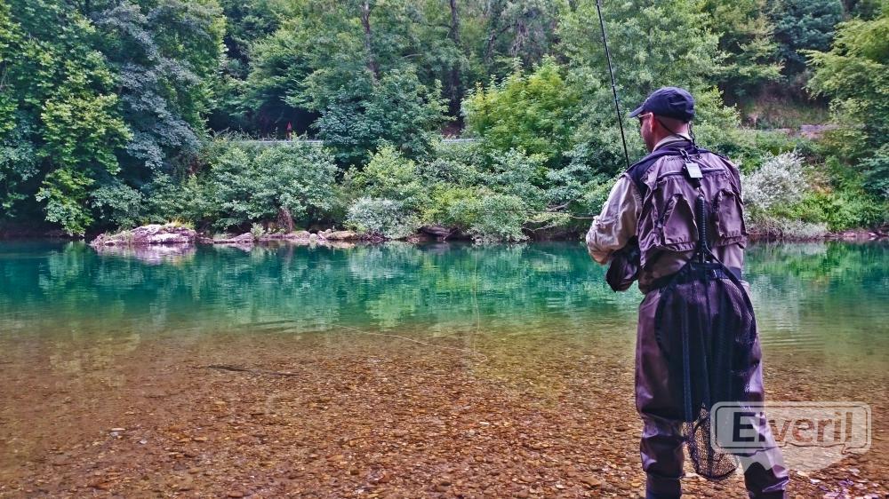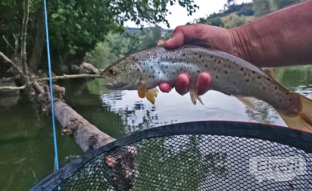 Por la mañana, repartimos el coto de Vilde, Juan se fue a la zona alta y yo acompañe a nuestro amigo Iván a la zona baja para que hiciera unos lances al Salmon. Empecé en el límite inferior , donde nada más llegar a la falda del pozo de la presa pude ver una cantidad impresionante de cebadas, que debido a que el sol que empezaba a salir me daba en los ojos no podía precisar si eran reos pintos o que.